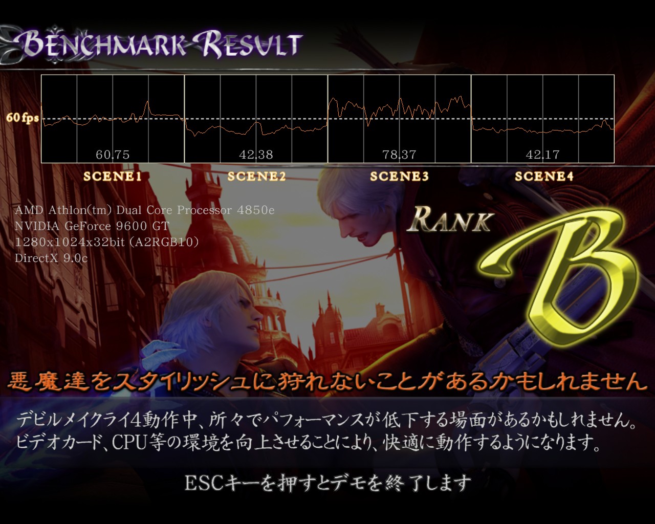 CPUの高速化は肝ではない、GeForce9600にしたことが大きな進歩。では早速いままでほとんどまともに動かなかったデビルメイクライ4の体験版ベンチマークを。。。