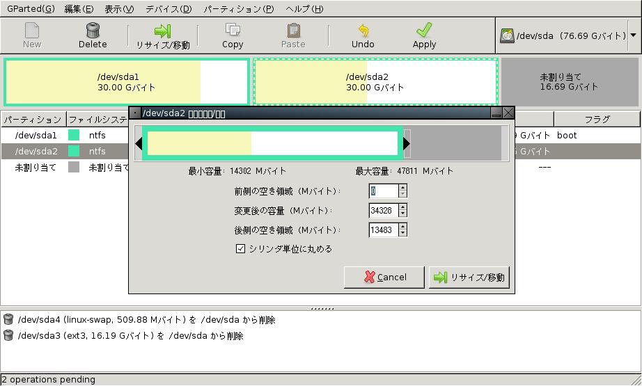 で、マウスをちょっとカチカチしただけで、あっさりとNTFSのパーティションの後にあったLinux用パーティションを連結できました。
