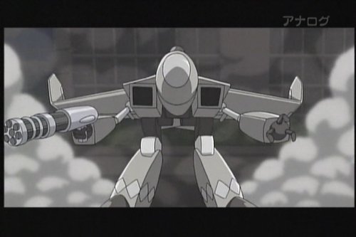 バトロイド(っぽい)形態への変形シーンはありませんでした。一瞬で形状変化。コックピットが頭部になっているあたりはVFと大きく違いますね。