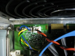 このリンク先に上のような具体的な接続方法が載ってるわけなんですが、赤と黒のケーブルがつながっているコネクタをVGAカードに挿している図に注目すると、手元の実物(下の写真)と比べるとケーブルの色が逆転していました。