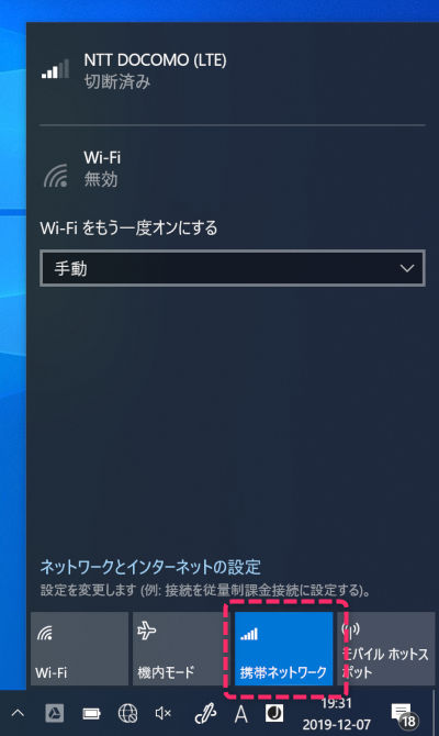 デスクトップ右下のネットワークアイコンをクリックして、携帯ネットワークが有効になっているのを確認します。