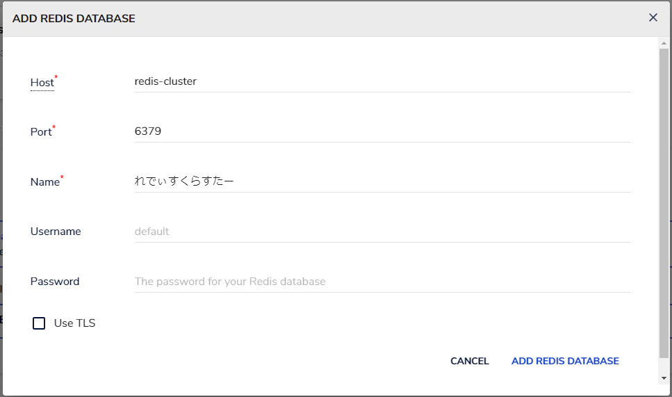 Connect to a Redis Databaseをクリックすると下記のようなダイアログが表示されます。