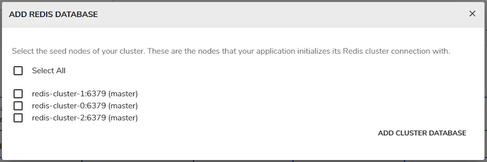 クラスターに所属するノードが一覧で出てきますので、全部にチェックを入れてADD CLUSTER DATABASEをクリックで完了です。