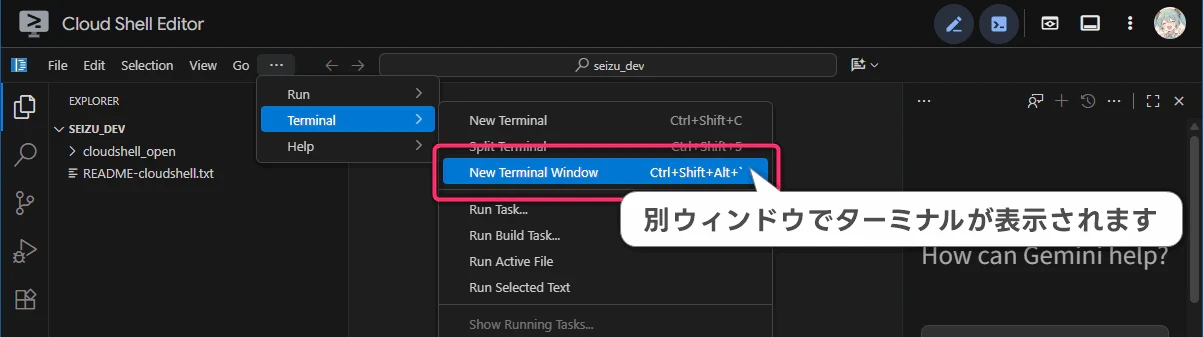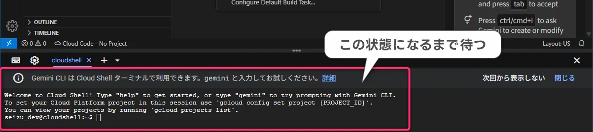 - 画面下にターミナルが表示されるまで待機します。