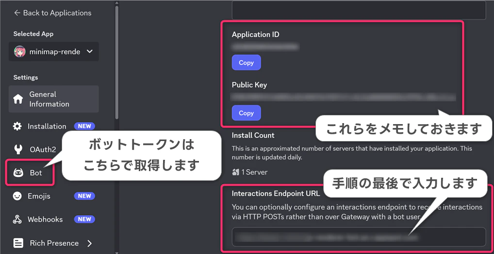 WoWs Minimap Renderer)を入力して作成します。 - 左メニューの「Bot」を選択し、「Reset Token」をクリックしてトークンを取得し、メモしておきます。